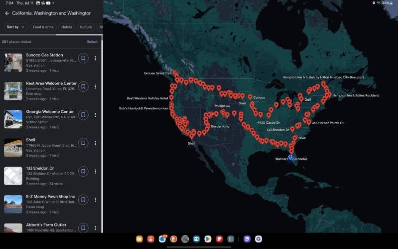 The red marks show all the places we visited in our travels. According to Google maps we traveled 10,011 miles all in 56 days Avg 179 miles a day...WOW!!!! That is according to Google maps, according to Greg's speedometer we traveled over 13,600 miles. We will double check.