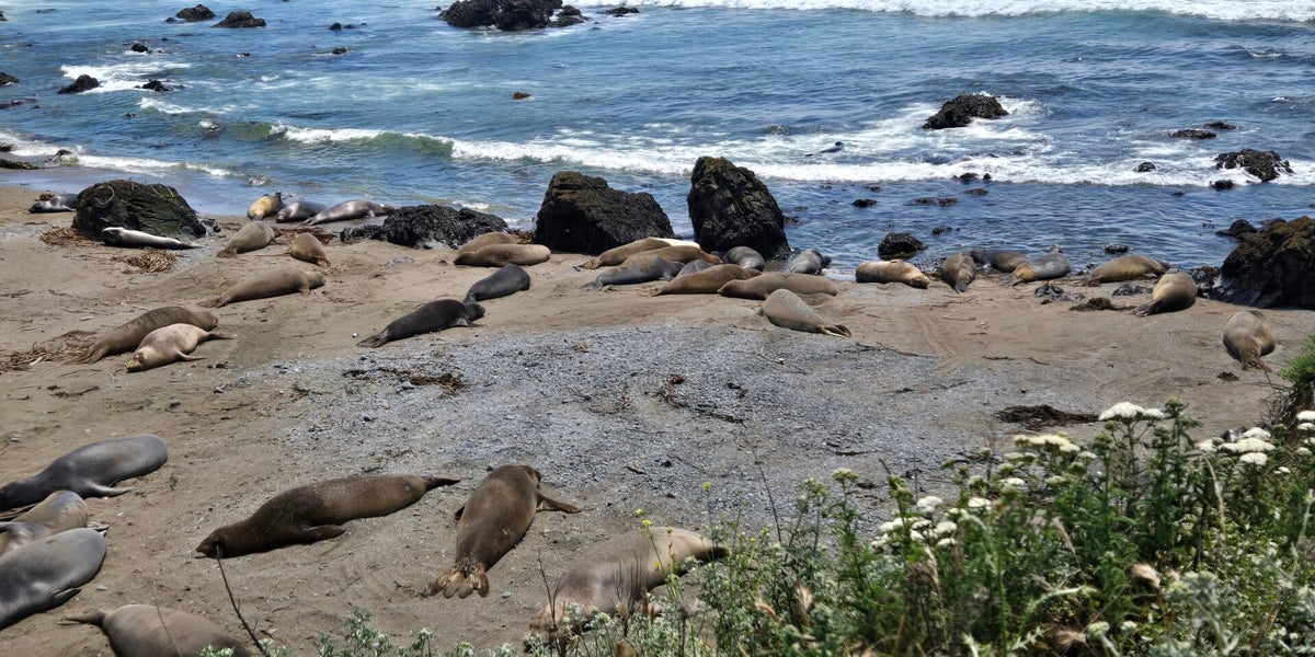 We visited the elephant seals along the PCH at the Elephant Seal Vista Point. We met Bob who was a volunteer tour guide. He told us all about the elephant seals. He made us aware that all the seals on the beach were females and pups. All the males were up in Alaska feeding. Fun Fact: Bob stated the males go up to Alaska to feed and their feeding grounds are where the Orcas go during the same time. The seals go to eat and potentially be eaten by Orcas.